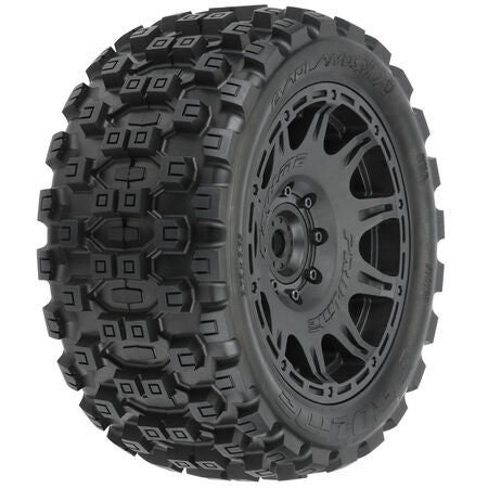 Inspired by popular full-size off-road wheels, the Raid 5.7" wheel is extremely tough and has a bold style to match. The Badlands MX57 tires are glued to the big diameter Raid wheel for the ultimate in lightweight, all-terrain performance. This tire and wheel package is proudly manufactured at Pro-Line Headquarters in the USA! If you are ready to take your X-MAXX® and KRATON™ 8S to the next level of Performance and Durability, then you need Pro-Line's new Badlands MX57 Tires mounted to Raid 5.7" Wheels!