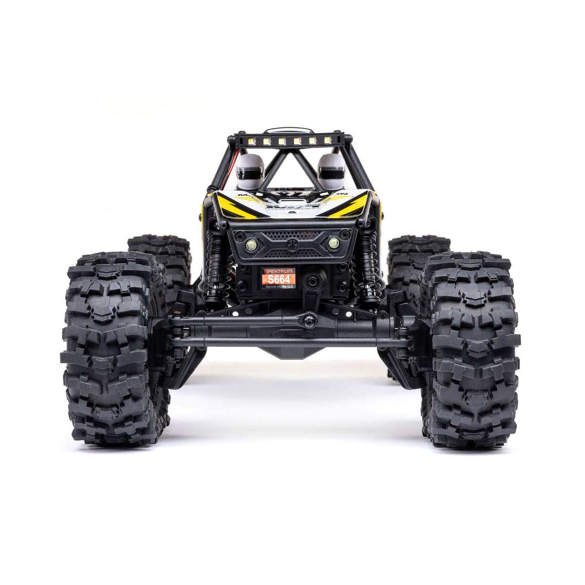 Axial highlights the 1/18 scale realism with working LED headlights, light bar, and forward facing rock lights for crawling after the sun sets.