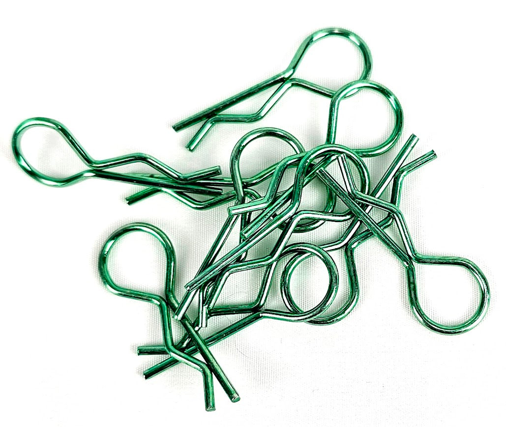 Call us at +1 (681) 217-2032 and ask for next availibility1/8 Bent Body Clip Green. These measure approximately 1 3/8" long. (10 pack)