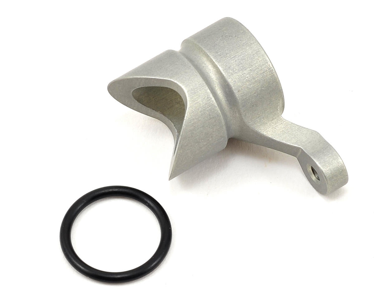 This is the optional Kyosho Aluminum Upper Servo Saver. The current crop of high torque, high voltage servos can punish the stock servo saver system, reducing the life of the spring. So Kanai developed this servo saver horn, to eliminate unwanted flex in the sevo saver assembly for an improved steering feel. Additionally, this servo saver is unique in that it features a lubrication hole that allows you to add grease or a light oil to the servo saver assembly when needed, and uses groove/o-ring design to cover the hole and help keep dirt from contaminating the assembly.