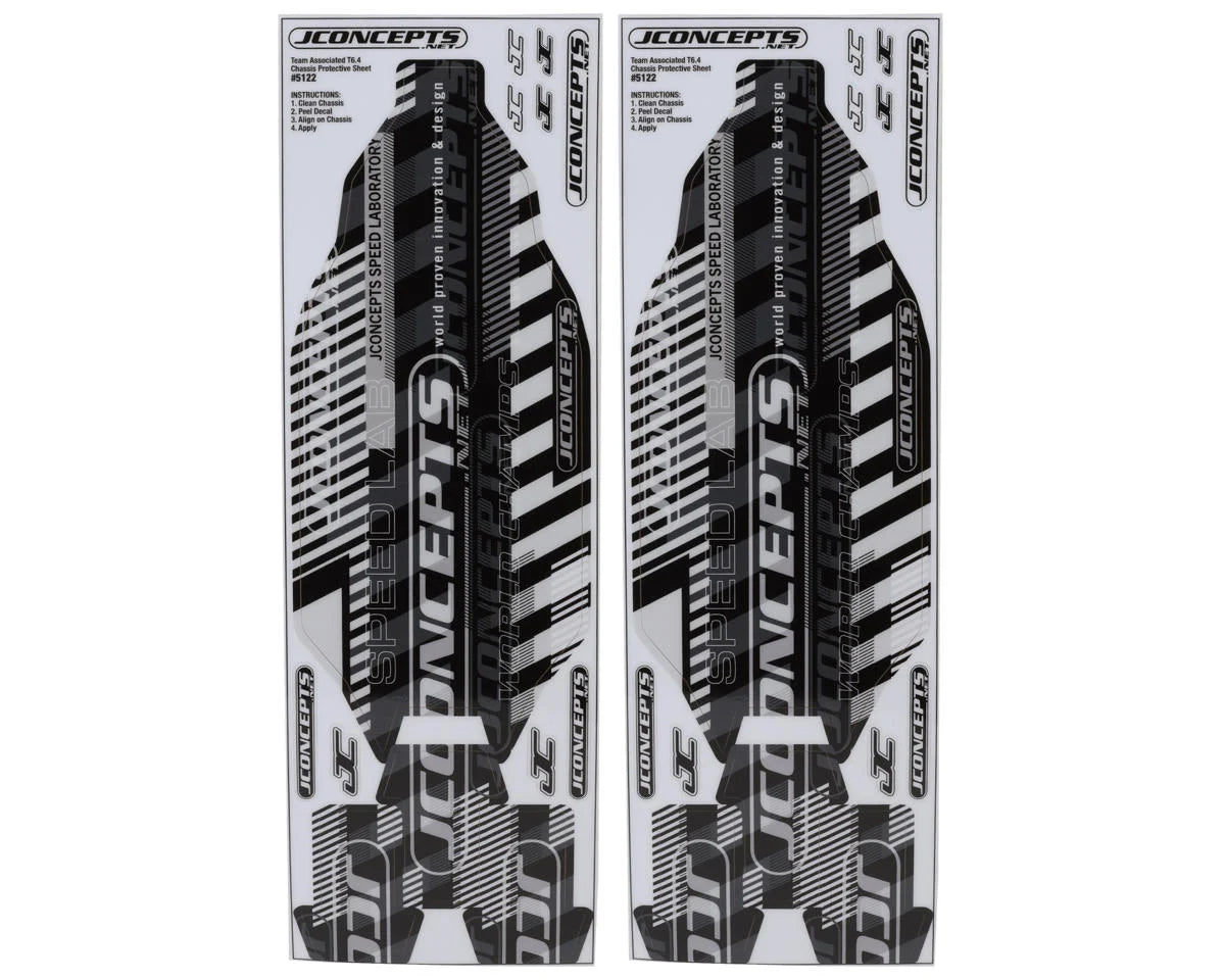 JConcepts Team Associated RC10T6.4 Precut Chassis Protective Sheets. Pre-cut to perfection, lining up to the popular RC10T6.4, the abstract design catches the eye and carries on a legacy of high-end chassis protectors. The 2-piece design, which includes three separate rear chassis pieces features italicized graphics in a high-speed fashion, embodies all that is great about competition.