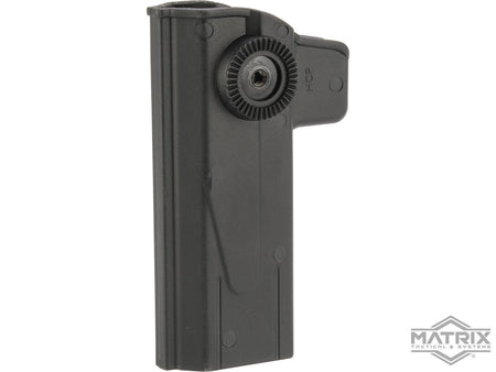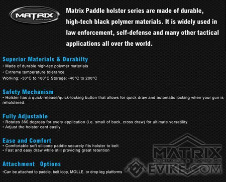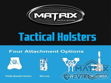This holster is manufactured in collaboration of Matrix Tactical Systems and a manufacturing facility that produces real steel fire-arm holsters. The Matrix Group brings you an injection molded hard shell holster with trigger lock specifically designed for airsoft pistols using the same manufacturing process as real steel holsters. It is compatible with Tokyo Marui, WE-Tech, and most other similar Airsoft pistols as well as real firearms.