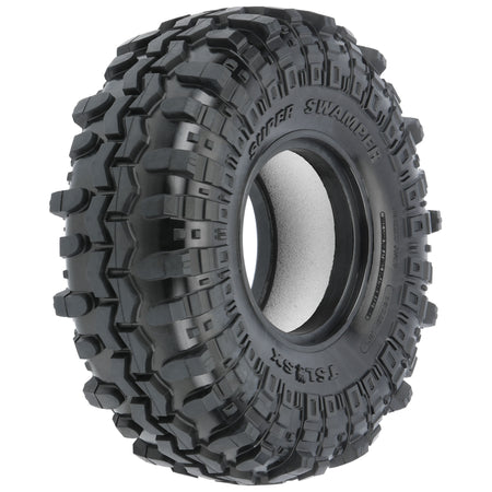 This is a pair of Interco® Super Swamper® TSL SX 1.55" Crawler Tires. Under official license from Interco® Tire Corporation, Pro-Line is proud to announce our first ever tire for 1.55" size wheels: the legendary Super Swamper® TSL SX! With "almost scale" not being acceptable and access to Interco's design data, Pro-Line's engineering staff has reproduced the original Super Swamper® in a scale configuration matched by none. The 3.85" tall by 1.45" wide Class 0 tire is perfect for those ultra-scale 1.55" wheel rigs begging for matching scale tires combined with unmatched rock crawling performance.