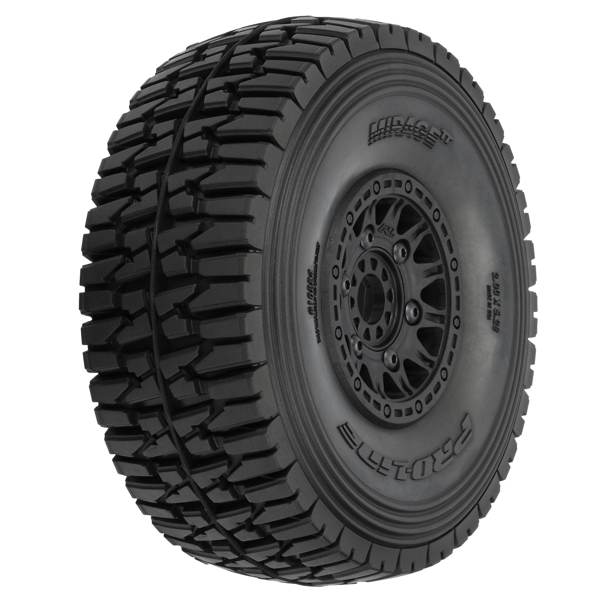 This is a pair of Mirage TT Belted Tires. Pro-Line is proud to announce a tire and wheel combo for your large-scale Desert Truck! The Mirage TT is inspired by full-size trophy truck tires to create a super-scale look while also giving your rig the ultimate performance upgrade with Belted tire technology!