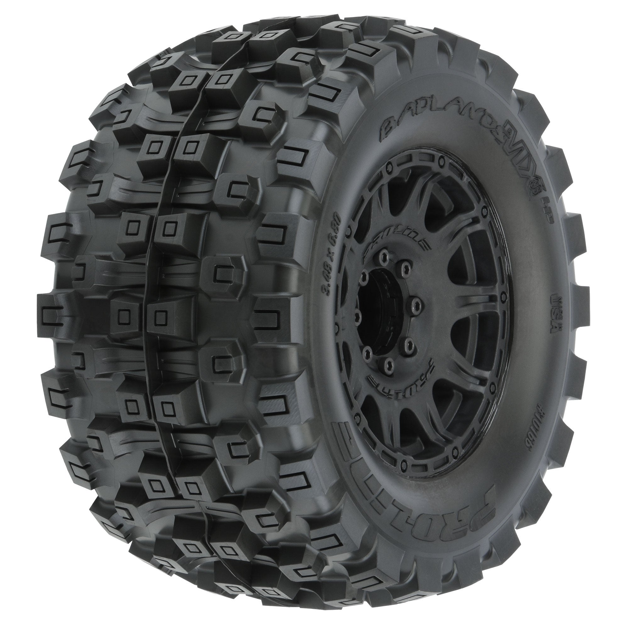 This is a pair of pre-mounted Badlands MX38 HP 3.8" Belted Monster Truck Tires. Pro-Line is taking the 3.8" tire game to the next level with the Baddest tire ever conceived: the Badlands MX38 HP BELTED tires! Pro-Line Badlands tires are known for having a sweet Motocross-inspired tread and the Badlands MX38 HP tires kick that up a notch with Bigger and Bolder knobby tread. The Badlands MX38 is a true All-Terrain tire that will find traction on any surface but is best suited for loose & loamy dirt, mud or grass. Just imagine your truck throwing up huge rooster tails with these awesome-looking tires!