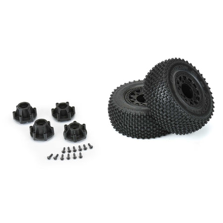 The Gladiator SC tires are mounted to a pair of Raid SC Removable Hex Wheels. We take the guesswork out of your glue job by doing the mounting for you so you can spend your time having fun! Pro-Line is proud to introduce a true next-generation Short Course wheel design the Raid 2.2"/3.0" Removable Hex Wheel for all Short Course Tires! Imagine being able to easily change the offset of your wheel to fit different applications by simply changing out the hex! Now you can with the 6x30 Removable Hex system from Pro-Line. The wheels include a pair of 12mm Slash® 4x4 Front/Rear (Slash® 2wd Rear) hexes, a pair of 12mm Slash® 2wd Front hexes, a pair of 12mm ProTrac™ hexes and a pair of 14mm hexes that fit the most popular trucks. Optional replacement 14mm, 17mm and ProTrac™ offset 12mm hexes (PRO635500) are available separately. If your wheel hex ever gets damaged, it can easily be replaced without needing to replace your glued tires (PRO635400 Replacement Slash® Hexes only)! These Raid SC wheels accomplish all of this and more by using Pro-Line's unique 6x30 interlocking hex design that is secured to the wheel by 6 M3 screws that are spaced 30mm across. The built-in adjustability and ease of use make this a must-have wheel for Short Course Trucks everywhere! Get your Raid SC pre-mounted tires today!