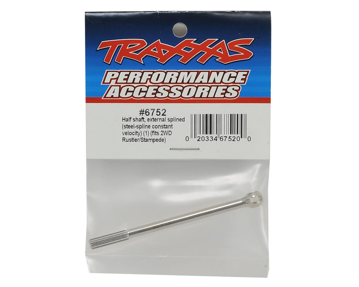 Traxxas External Splined Half Shaft. This is the male end half shaft that works with the CVD type driveshafts. Package includes one half shaft.